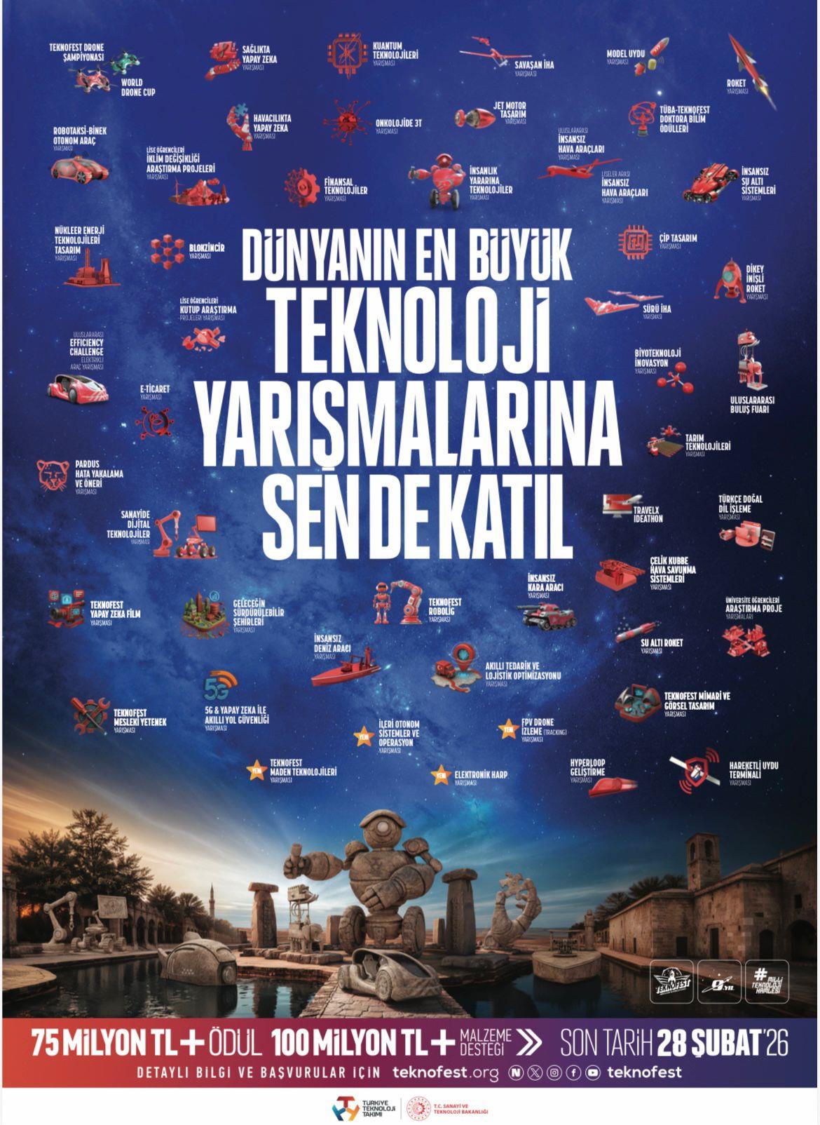 Türkiye’nin en büyük havacılık, uzay ve teknoloji festivali TEKNOFEST kapsamında düzenlenen TEKNOFEST 2026 Teknoloji Yarışmaları için başvurular devam ediyor. 30 Eylül–4 Ekim 2026 tarihleri arasında Şanlıurfa’da gerçekleştirilmesi planlanan TEKNOFEST 2026’da yarışmalara katılarak projelerini geliştirmek ve sergilemek isteyen ekipler, başvurularını TEKNOFEST’in başvuru sayfası üzerinden gerçekleştirebilir. Başvuru süresi, yoğun talep üzerine güncellenmiş olup son başvuru tarihi 28 Şubat 2026’dır.