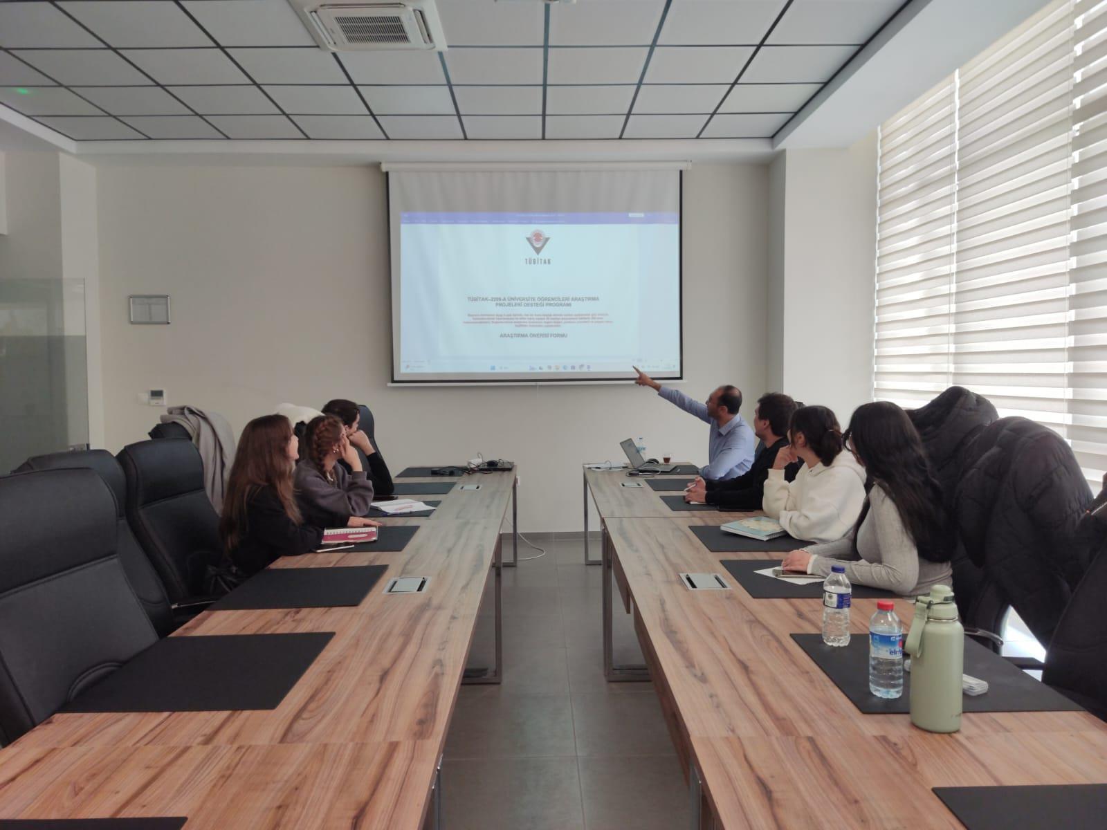 7 Kasım 2025 Cuma günü Karacaoğlan Toplantı Salonu’nda gerçekleştirilen programda, TÜBİTAK 2209-A Üniversite Öğrencileri Araştırma Projeleri Destekleme Programı kapsamında proje hazırlama ve başvuru süreçleri, araştırma önerisi yazımı, etik ilkeler ve proje yürütme aşamaları ele alındı. Ayrıca eğitim kapsamında öğrenciler, üç ayrı çalışma grubuna ayrılarak daha detaylı ve birebir uygulamalı proje hazırlama eğitimi aldı. Katılımcılar, proje yazım sürecini uygulamalı olarak deneyimleme fırsatı buldu.