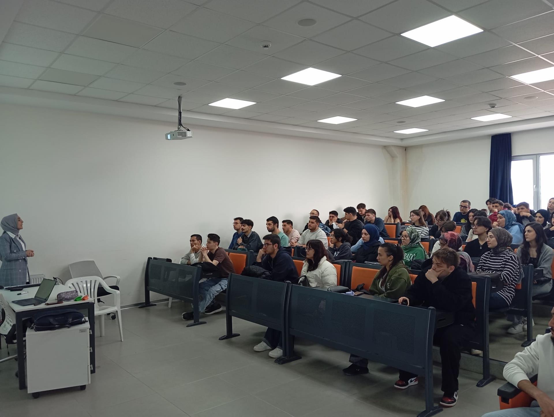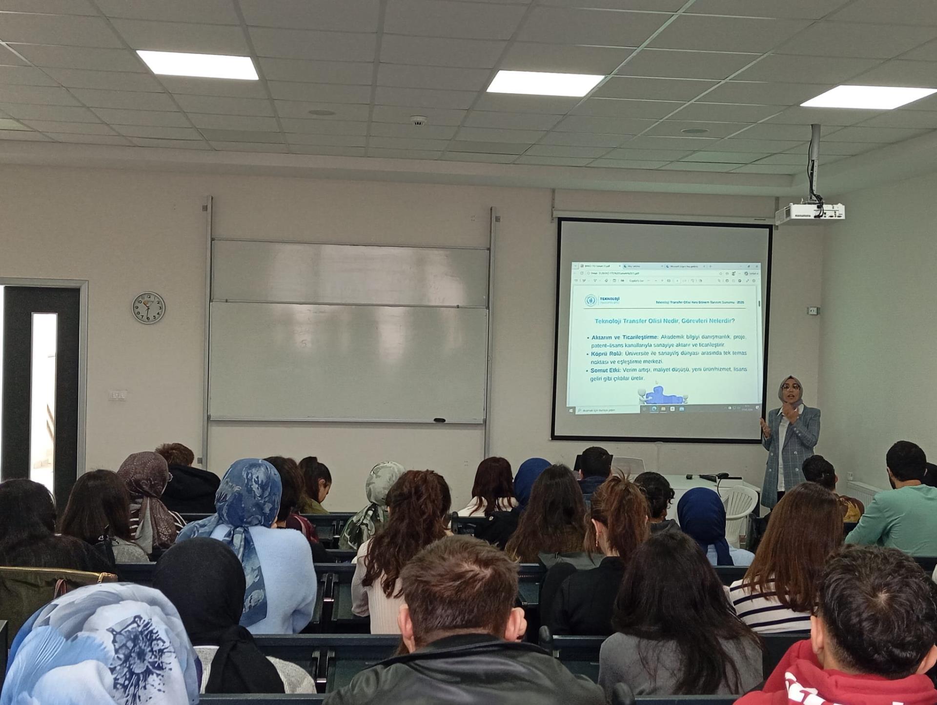 Öğrencilerin ilgiyle takip ettiği etkinlikte, üniversitelerde üretilen bilginin sanayiye aktarılması, girişimcilik, yenilikçilik ve proje geliştirme süreçlerine ilişkin önemli değerlendirmelerde bulunuldu. Sunum, öğrencilerin soru ve katkılarıyla etkileşimli bir şekilde tamamlandı.
